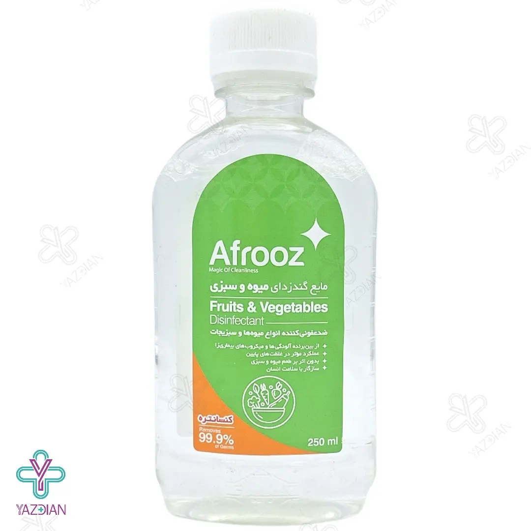 محلول ضد عفونی کننده سبزیجات افروز - 250 میلی لیتر (Afrooz Vagetable Disinfectant 250 ml Liquid) ساخت شرکت معروف عبیدی می باشد. این محلول قادر است تا در زمان کم و با قدرت بالایی سبزیجات را ضد عفونی کرده و بدین خاطر می توان بدون هیچ نگرانی ای از فواید سبزی بهره مند شد.