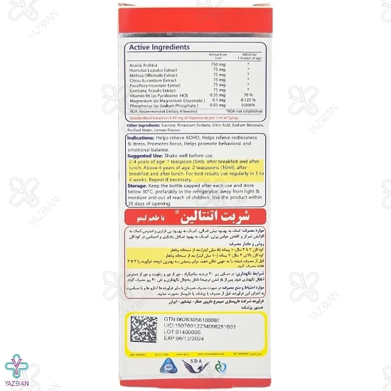 شربت اتنتالین یک داروی گیاهی برای بهبود بیماری بیش فعالی در کودکان است که باعث افزایش تمرکز شده و حواس پرتی، بی قراری و استرس را در کودکان کاهش می دهد. این شربت گیاهی همچنین به بهبود تعادل رفتاری و احساسی در کودکان کمک بسزایی می کند.