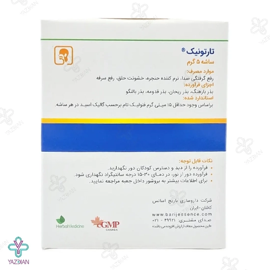 پودر ضد سرفه و گلو درد تارتونیک باریج اسانس (Barij Essence Tartonic 10 Saches) از دسته داروهای ضد سرفه و سرماخوردگی بوده که با درمان تارهای صوتی، سرفه و گلو درد را در شخص بیمار آرام می کند. این محصول باعث می شود تا صدای گرفته باز شود، هم چنین التهاب ایجاد شده در سینه را بهبود بخشیده و عفونت گلو را درمان می کند.