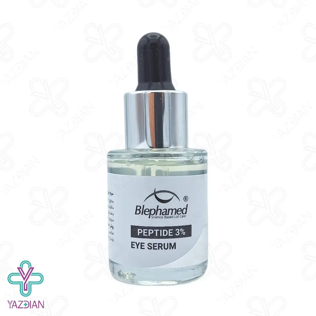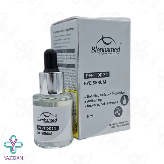 سرم دور چشم پپتید 3 درصد بلفامد (Blephamed peptide eye serum – 15 ml) علائم پیری را کاهش داده و سبب بهبود ظاهر قسمت دور چشم می شود، از دیگر ویژگی های این محصول این است که میزان تولید کلاژن را افزایش داده و به همین دلیل چین و چروک و خطوط ریز نیز کم می شود و در نتیجه پف و تیرگی پوست دور چشم از بین رفته و صاف تر و جوان تر می شود و هم چنین ساختار پوست را تقویت انعطاف پذیری آن را زیاد می کند، این محصول اثرگذاری چشم گیری دارد و پس از مدتی استفاده ی مرتب تغییر بسیار زیادی در ناحیه ی دور چشم خواهید دید، پپتاید ماتریکسیل مورفومیکس از ترکیبات به کار رفته در این سرم است که باعث لیفت دور چشم و هم چنین مانع از افتادگی پوست می شود، سدیم هیالورونات از دیگر ترکیبات موجود در این محصول بوده و از آن جایی که پوست دور چشم بدون غدد چربی است و به شدت در معرض خشکی قرار دارد این ترکیب موجب آب رسانی و حفظ رطوبت در این قسمت می شود، وجود پتنت که سد دفاعی پوست را احیا و بازسازی می کند نیز در این محصول وجود دارد.
