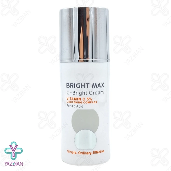 کرم جوان کننده صورت و گردن ویتامین ث برایت مکس (Bright Max C Bright cream - 30 ml) با ترکیبات موثری که دارد ضمن روشن شدن پوست موجب کاهش پیری پوست شده و لک های تیره پوست را نیز رفع کرده و موجب استحکام پوست می شود این محصول با ترکیبات سبکی که دارد زود در پوست جذب شده و میزان رطوبت پوست را افزایش می دهد و لایه محافظ پوست را آب رسانی و ترمیم می کند ویتامین سی موجود در این محصول عملکرد آنزیم تیروزینار را مهار کرده و در نتیجه از سنتز ملانین جلوگیری می کند و موجب بهبود لک های پوستی می شود این محصول با ترکیبات آنتی اکسیدانی مانند فرولیک اسید و ویتامین E از ایجاد لک جلوگیری کرده و مانع از اثرات مخرب رادیکال های آزاد بر روی پوست می شود رتینول موجود در این محصول موجب تحریک ساخت کلاژن شده و خطوط ریز پوست را کاهش می دهد و موجب شادابی و شفافیت پوست می شود و هم چنین دارای کمپلکس درماوایت نیز می باشد کرم جوان کننده برایت مکس مناسب انواع پوست بوده و با دارا بودن ترانگزامیک اسید مانع از تولید ملانین شده و لک های ایجاد شده در اثر آکنه را نیز رفع می کند.