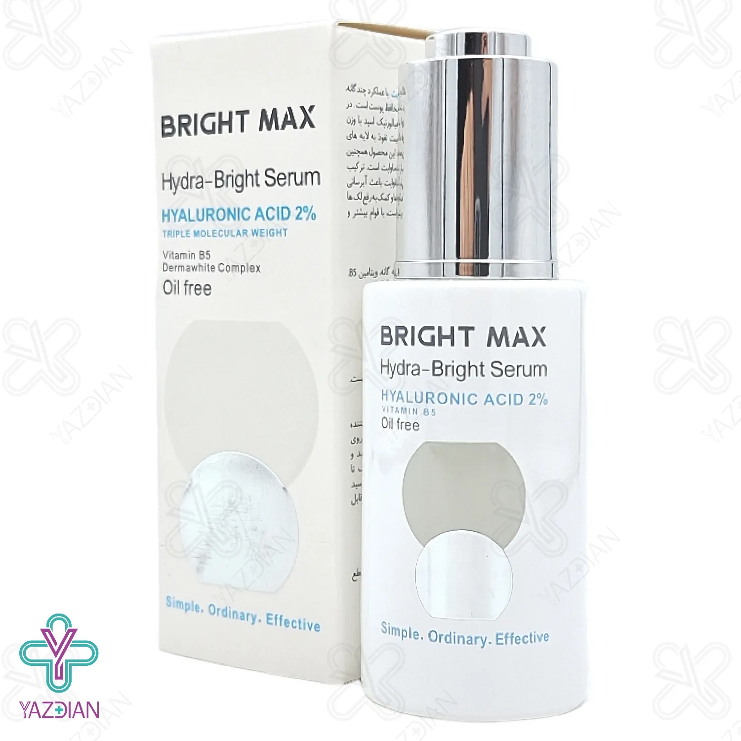 سرم هیالورونیک اسید 2 درصد برایت مکس - 30 میلی لیتر (Bright Max Hydra Bright Serum 30 Ml) از بین برنده قدرتمند چین و چروک های پوستی و لک و تیرگی های ناشی از کمبود آب پوست می باشد. همچنین با تحت کنترل قرار دادن تولید ملانین سازی پوست، در رفع هایپرپیگمانتاسیون های پوستی نقش موثری داشته و از بروز آن ها پیشگیری می کند. بافت سبک این سرم سبب شده است تا به سرعت جذب پوست شود و به هیچ وجه روی پوست حس سنگینی ایجاد نکند. بعلاوه لایه های محافظتی پوست را تقویت کرده و با تثبیت پروتئین ها و ترمیم بافت سلولی، کمک به شادابی و طراوت هر چه بیشتر پوست می کند.