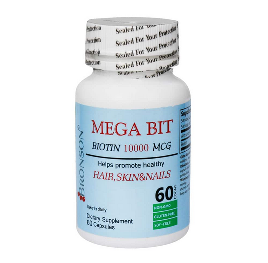 کپسول بیوتین 10000 میکروگرم مگابیت برونسون (Bronson Msga Bit Biotin 10000 mcg capsules – 60 pcs) یک مکمل مناسب جهت حفظ سلامت پوست، مو و ناخن ها می باشد این محصول دارای بیوتین یا همان ویتامین H می باشد که در متابولیسم درشت مغذی ها بسیار موثر می باشد بیوتین موجب تقویت فولیکول های مو شده و در کاهش ریزش مو و افزایش رشد آن بسیار موثر می باشد مکمل بیوتین برونسون موجب کاهش و بهبود بیماری های التهابی پوست شده و با حفظ رطوبت پوست موجب کاهش خشکی و پوسته پوسته شدن می شود و هم چنین موجب تقویت و افزایش استحکام ناخن ها شده و برای افرادی که دارای ناخن های شکننده می باشند بسیار کارآمد می باشد این محصول هم چنین موجب کاهش ابتلا به بیماری های قلبی شده و موجب کنترل کلسترول خون نیز می شود و با تنظیم قند خون برای افراد دیابتی نیز مفید می باشد.