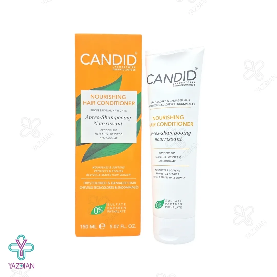 نرم کننده موهای خشک و آسیب دیده کاندید (Candid Nourishing Hair Conditioner For Damaged and Colored hair 150 ml) یکی از بهترین نرم کننده مو در داروخانه هاست و سبب آب رسانی عمقی و تغذیه ی مو می شود. این محصول از مو در مقابل انواع آسیب ها مثل رنگ کردن و عوامل محیطی حفاظت کرده و هم چنین استفاده ی مداوم از آن سبب بهبود کیفیت و دوام رنگ موهای رنگ شده می شود. از دیگر ویژگی های این نرم کننده این است که باعث افزایش شانه پذیری موها شده و درخشش طبیعی آن را نیز زیاد می کند.