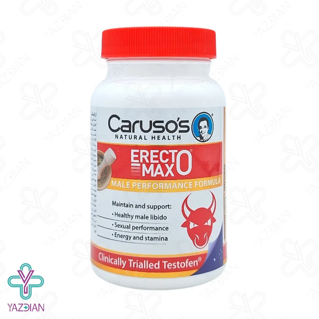 قرص تقویت آقایان ارکتومکس کارسوس نچرال هلث - 30 عددی (Carusos Natural Health Erecto Max ۳۰ Tabs) سرشار از ریز مغذی ها از جمله زینک و ویتامین B6 و عصاره های گیاهی مثل شنبلیله، جینسینگ، ریشه گزنه و گیاه جو می باشد. این قرص در واقع یک محصول تقویت قوای جنسی مردان می باشد که با تعدیل سطح هورمون جنسی، اختلالات جنسی در مردان را بهبود و درمان کرده و ضمنا باعث افزایش قوا و میل جنسی می شود. این فرآورده فاقد گندم، ذرت، مخمر، شکر، لاکتوز، فرآوردههای با منشا حیوانی، رنگ مصنوعی و مواد نگهدارنده است، اما حاوی گلوتن می باشد.