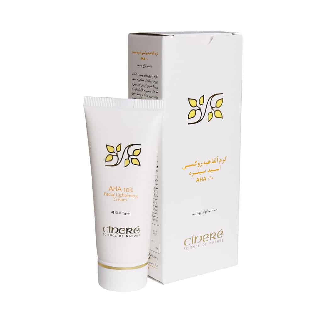 کرم لایه بردار AHA10% سینره - 40 میلی لیتر(Cinere AHA ۱۰% Facial Lightening Cream ۴۰ ml) با نفوذ پذیری بالای خود، قادر است تا به لایه شاخی پوست نفوذ کرده و با سست نمودن اتصالات بین سلولی، سلول های کهنه و مرده را از روی پوست پاکسازی می کند. همچنین کلاژن و الاستین سازی پوست را تقویت می کند و سبب ترمیم و احیای بافت پوست می شود. این کرم خاصیت لایه برداری ملایمی دارد و بدون اینکه باعث تحریکات پوستی و قرمزی شود، با نوسازی سلول های پوستی، سبب محو سازی جای جوش و آکنه های پوستی و روشن شدن رنگ پوست می شود. جهت خرید یا مشاهده محصولات دسته روشن کننده و ضد لک به سایت ما مراجعه فرمایید.