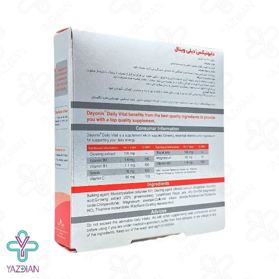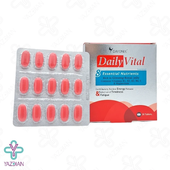 قرص مولتی ویتامین دیلی ویتال دایونیکس فارما - 30 عددی (Dayonix Pharma Daily Vital ۳۰ Tabs) یکی از بهترین مولتی ویتامین های موجود در بازار می باشد که با بهره گیری از رویال ژلی، گیاهان جینسینگ، منیزیم، ویتامین C و ویتامینهای گروه ب، کمک به تقویت سیستم ایمنی و قوای جسمی و ذهنی فرد می کند. این قرص توسط شرکت الحاوی تحت لیسانس دایونیکس فارما انگلستان می باشد که فرمولاسیون فوق العاده با کیفیت و خاصی دارد.