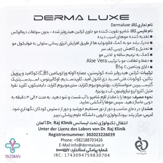 شامپو کراتین فاقد سولفات درمالوکس (Derma Luxe Keratin Shampoo 300 ml) دارای کراتین هیدرولیز شده به همراه ویتامین های C و B5 بوده و می تواند با دارا بودن خواص تقویت کنندگی، موها را ترمیم و بازسازی نماید و رشد مجدد آن ها را تحریک کند. این محصول همچنین نرمی، لطافت و درخشندگی در موها را افزایش داده و ریشه های مو را استحکام می بخشد.