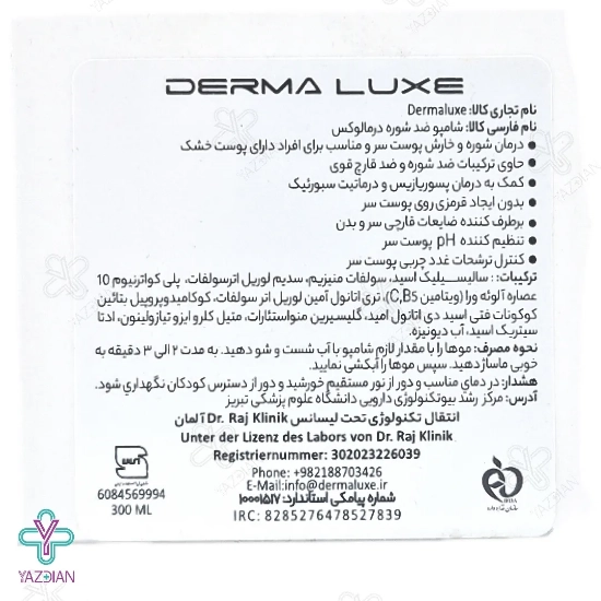 شامپو ضد شوره و خارش درمالوکس (Derma Luxe Shampoo Anti – Dandruff 300 ml) با بهره گیری از ترکیبات مؤثر و ارزشمندی نظیر اسید سالیسیلیک، گلیسیرین، عصاره آلوئه ورا و ویتامین های C و B5 در فرمولاسیون خود می تواند خارش و شوره پوست سر را برطرف نماید و از این جهت استفاده از آن برای افراد دارای پوست سر خشک مناسب می باشد.