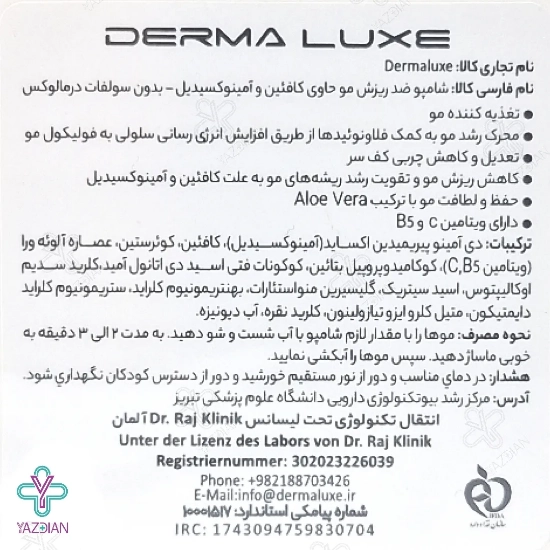 شامپو تقویت کننده کافئین آمینوکسیدیل درمالوکس (Derma Luxe Shampoo Anti Hair Loss Aminoxidil Caffeine 300 ml) با دارا بودن کافئین، آمینوکسیدیل، آلوئه ورا به همراه ویتامین های C و B5 در فرمولاسیون خود می تواند ضمن تغذیه رسانی و انرژی رسانی سلولی بیشتر به فولیکول های مو، ریزش موها را متوقف کرده و باعث رشد بیشتر ریشه های جدید مو می شود.