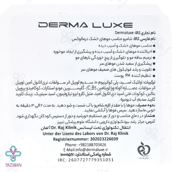 شامپو موی خشک درمالوکس (Derma Luxe Shampoo For Dry Hair 300 ml) با دارا بودن ترکیبات ارزشمند ویتامینه نظیر ویتامین های C و B5 به همراه عصاره آلوئه ورا، گلیسیرین، اسید سیتریک ، اسید سیتریک و زینک کلرید در فرمولاسیون خود می تواند موها را به خوبی تقویت کرده و ضمن احیا و نوسازی موهای آسیب دیده، باعث بهبود رشد موها نیز شود.