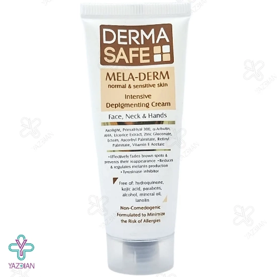 کرم روشن کننده ملادرم درماسیف - 25 میلی لیتر (Derma Safe Mela Derm Intensive Depigmenting Cream 25 ml) با برخورداری از ویتامین های A، C و E، عصاره شیرین بیان و آلفا آربوتین، AxolightTM ،PrimalHyalTM 300، انواع لک های پوستی مقاوم نواحی گردن، صورت و دست را درمان و برطرف کرده و مانع از بازگشت مجددشان می شود.