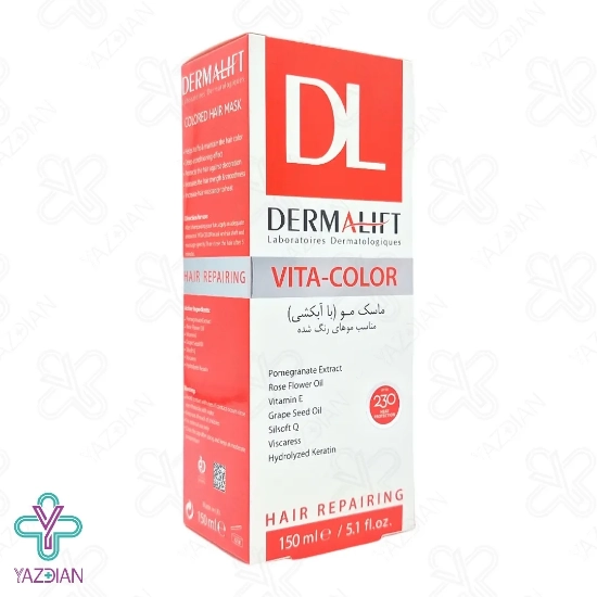 ماسک مو های رنگ شده ویتا کالر درمالیفت (با آبکشی) - 150 میلی لیتر (Dermalift Vita Color Hair Mask ۱۵۰ ml) با فرمولاسیون ویژه و موثر خود، ثبات و ماندگاری رنگ مو ها را دو چندان می کند و مانع از کدری و رنگ پریدگی می شود. این ماسک مو با ایجاد یک لایه محافظتی گسترده روی موها، عوارض و آسیب های ناشی از دکلره را به حداقل مقدار خود می رساند و مقاومت مو ها را در برابر استفاده از وسایل حرارتی مثل اتو مو، سشوار و ... بالا می برد.