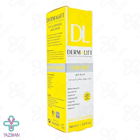 سرم موهای خشک و آسیب دیده ویتا درای درمالیفت (Dermalift Vita Dry Serum For Dry And Damaged Hair – 100 ml) موهای خشک و آسیب دیده را ترمیم کرده و باعث درخشش و استحکام می شود، از دیگر ویژگی های این محصول این است که مو را تغذیه کرده و موجب آب رسانی و مرطوب شدن موها می شود و نیز گره ی ایجاد شده در موها را به راحتی باز می کند، روغن آرگان از ترکیبات به کار رفته در این سرم است که دارای خواص آنتی اکسیدانی موثر و قوی بوده و باعث تقویت رشد مو، ایجاد نرمی و لطافت و هم چنین مانع از شکنندگی آن می شود، روغن کالاندولا از دیگر ترکیبات موجود در این محصول بوده و باعث افزایش جریان خون در فولیکول مو می شود، این روغن هم چنین مو را قوی تر و مستحکم تر کرده و نیز موجب ترمیم ساقه ی مو و پیشگیری از به وجود آمدن موخوره می شود و با ایجاد یک لایه ی حفاظتی از موها در مقابل آلودگی و عوامل زیان آور محیطی مراقبت می کند، آلوئه ورا نیز حاوی ویتامین های لازم برای مو است و باعث سلامتی پوست سر، استحکام ساقه ی مو، زیاد شدن میزان آب رسانی و تقویت رشد موها می شود، روغن آووکادو یک مرطوب کننده ی قوی در این سرم بوده و با انواع پوست و مو سازگاری دارد و نیز سبب تامین رطوبت مو با نفوذ بالا به لایه های کوتیکول می شود.