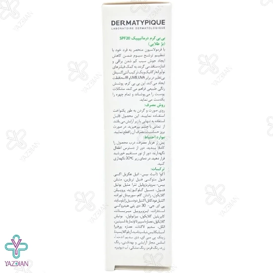بی بی کرم 20 SPF درماتیپیک بژ طلایی مخصوص پوست های چرب و مختلط است، این کرم با ترکیبی که دارد باعث می شود که ترشح چربی در پوست تنظیم شود و باعث شود که جوش در پوست ایجاد نشود و نیز میزان براقی و درخشندگی پوست نیز کاهش پیدا کند.
