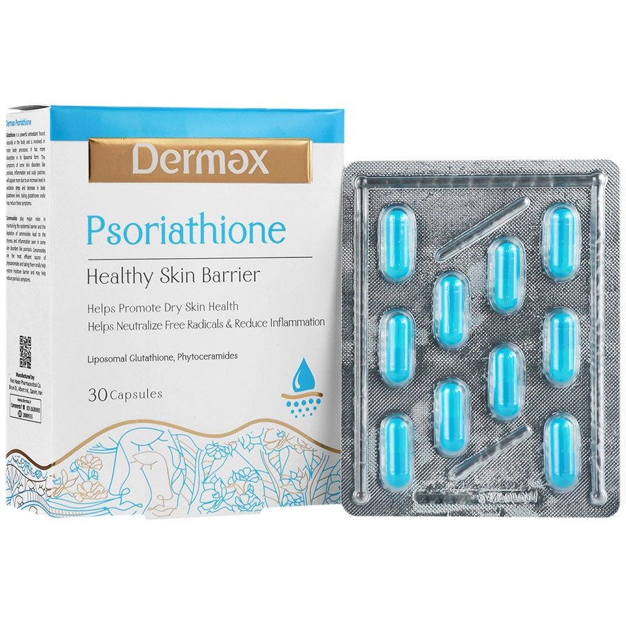 کپسول سوریاتیون درمکس - 60 عددی (Dermax Psoriathione 30 Caps) با بهره گیری از دو ماده موثره گلوتاتیون لیپوزومال و سراموزید، عملکرد عالی ای جهت التیام التهابات پوستی و حفظ سلامت پوست خشک دارد. این دو ترکیب محرک سنتز سرامید هستند و باعث حفظ سلامت سد دفاعی پوست و نگهداری میزان رطوبت لازم پوست می شوند. این مکمل با حفظ رطوبت لازم پوست و هیدارته نگه داشتن آن، باعث کاهش علائم پسوریازیس از جمله التهاب، خارش و پوسته ریزی ها را کاهش می دهد. شایان ذکر است تا در کنار این محصول از یک آبرسان استفاده فرمایید.