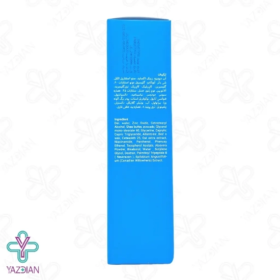 عصاره بید علفی غاری، آب دیونیزه، تری پپتید 8، زینک اکساید، پلمیتویل، ستو استئاریل الکل، دکستران، عصاره سبوس جو دو سر، بوتیلن گلایکل، آلانتوئین، آب، شی باتر و روغن آووکادو، بیزابولول، گلیسرول مونو استئارات 40، پودر برگ آلوئه ورا، گلیسرین، توکوفریل استات، کاپریلیک کاپریک تری گلیسرید، فنوکسی اتانول، موم زنبور عسل، دکسپانتنول، ستئارات 25، نیاسینامید.