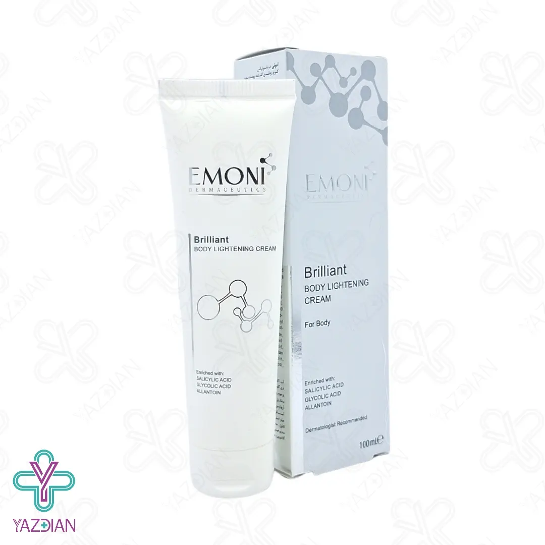 کرم روشن کننده بدن امونی - 100 میلی لیتر (Emoni Body Lightening Cream ۱۰۰ ml) از بین برنده عالی تیرگی های پوست به خصوص در ناحیه زیر بغل و کشاله ران می باشد. این کرم روشن کننده پوست قابل استفاده برای تمامی پوست ها می باشد و توصیه می شود 30 دقیقه پس از شستشوی ناحیه مورد نظر استعمال شود.