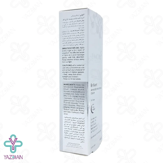 کرم ضد لک شب برلیانت امونی - 50 میلی لیتر (Emoni Brilliant Advanced Brightening Cream ۵۰ Ml) یک کرم ضد لک قوی می باشد که از بین برنده نقاط تیره پوست می باشد که پوست را صاف، یک دست و بی نقص نشان می دهد. بعلاوه خاصیت مرطوب کنندگی نیز داشته و از خشکی و دهیدراته شدن پوست جلوگیری می کند. با توجه به این که کرم ضد لک شب برلیانت امونی طراحی شده برای استفاده در شب می باشد، طی شب پوست را ترمیم و بازسازی می کند.