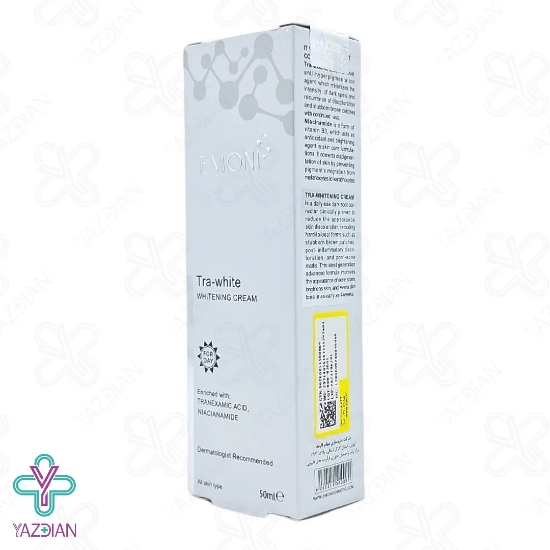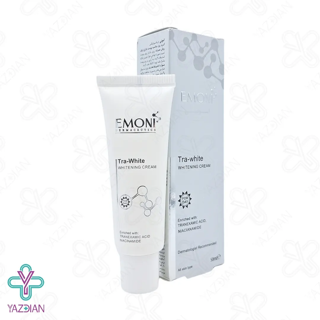 کرم ضد لک روز تراوایت امونی - 50 میلی لیتر (Emoni Tra White Whitening Cream ۵۰ ml) از دسته محصولات روشن کننده و ضد لک می باشد که با بهره گیری از نیاسینامید، ترانگزامیک اسید، روغن هسته انگور، لاکتیک اسید و مشتقات ویتامین C از بین برنده عالی لک و تیرگی های پوستی می باشد و پوستی صاف، شفاف و یکدست را به شما هدیه می دهد. این کرم خاصیت لایه برداری ندارد و بدین خاطر باعث ایجاد حساسیت نمی شود. این محصول قابل استفاده روزانه می باشد و در نتیجه در صورت استفاده منظم از این کرم طی 4 هفته، شاهد نتایج حاصل از این کرم خواهید بود.
