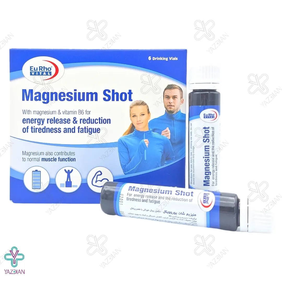 ویال خوراکی منیزیم شات یوروویتال (Eurho Vital Magnesium Shot 6 Dirinling Vials) دارای دو ترکیب ارزشمند و مؤثر نظیر منیزیم و ویتامین B6 بوده و می تواند ضمن بالا بردن میزان انرژی و کاهش خستگی، گرفتگی های عضلانی را برطرف کرده و عملکرد سیستم عصبی را بهبود ببخشد و به طور کلی یکی از بهترین داروهای تقویتی بدن محسوب می شود.