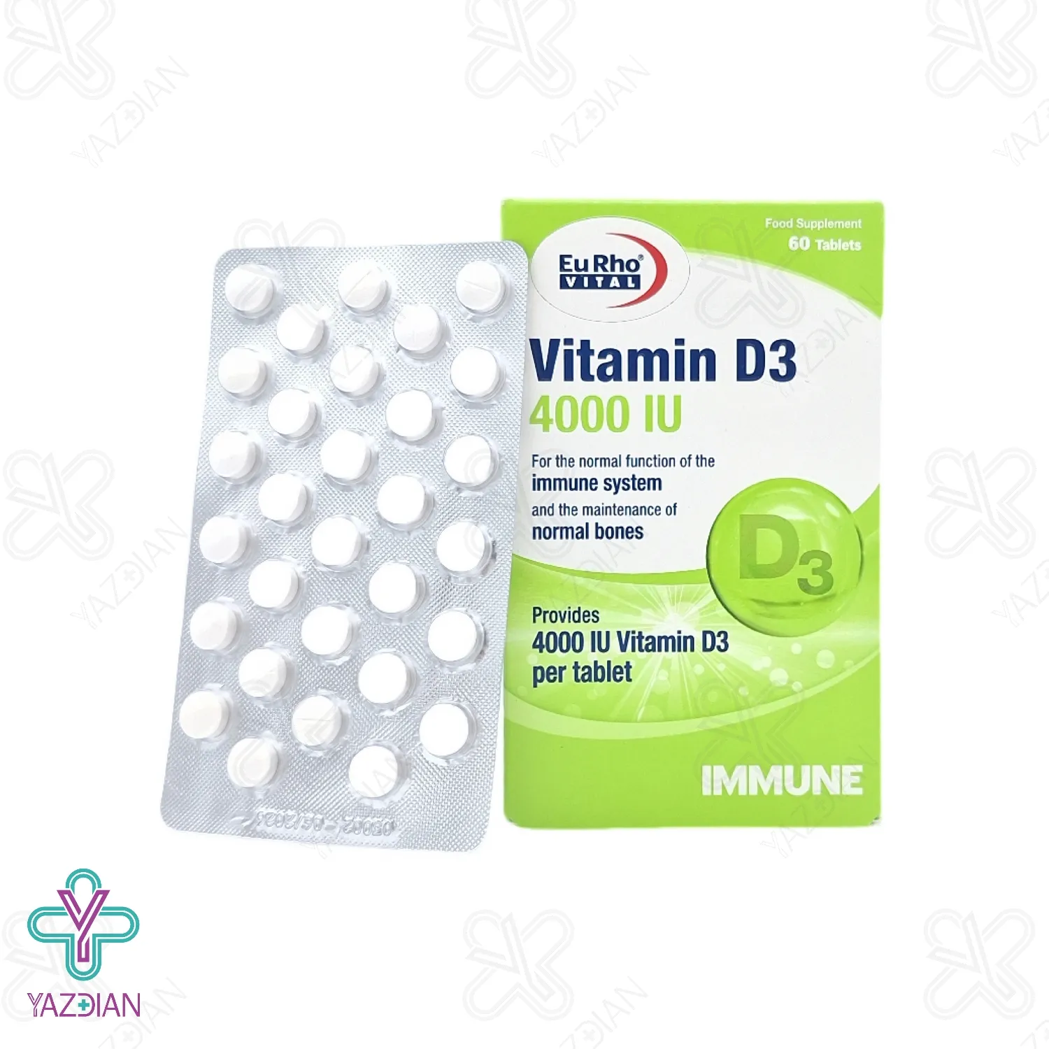 قرص ویتامین د3 4000 یوروویتال (Eurho vital vitamin D3 4000 ) یک مکمل مناسب جهت استحکام استخوان ها می باشد و موجب افزایش جذب کلسیم و فسفر از روده و کاهش دفع توسط کلیه ها می شود که در نتیجه موجب متابولسیم استخوان ها و جلوگیری از پوکی استخوان می شود قرص ویتامین د3 موجب تقویت سیتم ایمنی بدن شده و مانع از ایجاد مشکلات در اثر کمبود ویتامین د در بدن می شود در صورتی که بدن به اندازه کافی ویتامین د نداشته باشد استخوان ها نرم و شکننده می شوند و مشکلاتی مانند راشیتیسم در کوکان و استئومالاسی در بزرگسالان را ایجاد می کند این محصول موجب حفظ تراکم استخوان ها می شود قرص ویتامین د3 موجب کاهش التهاب و جلوگیری از ابتلا به بیماری های عفونی، باکتریایی و ویروسی می شود ویتامین د هم چنین از ابتلا به بیماری های قلبی و عروقی جلوگیری می کند و منجر به حفظ سلامت قلب و عروق می شود.