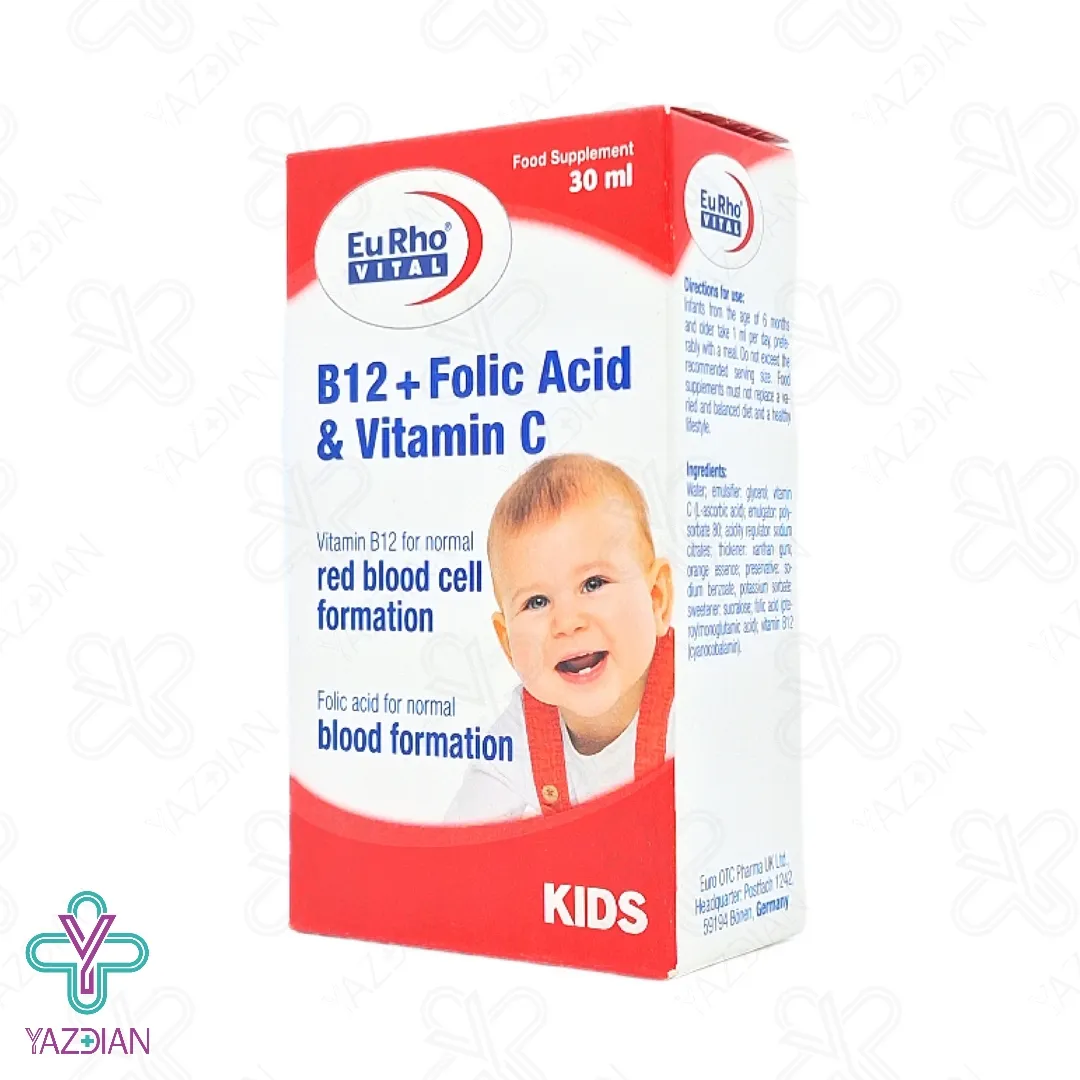 قطره ب12 فولیک اسید و ویتامین ث یوروویتال (Eurhovital B12 Folic Acid And Vitamin C Drops – 30 ml) به بهبود رشد جسمی و ذهنی کودکان کمک کرده و هم چنین انرژی مورد نیاز بدن را نیز فراهم می کند، از دیگر ویژگی های این محصول این است که به ساخت گلبول های قرمز و برطرف شدن کم خونی بسیار کمک می کند، این قطره دارای طعم دل نشین پرتقال است و سیستم ایمنی را تقویت کرده و این توانایی را دارد که شدت و مدت بیماری های عفونی به ویژه سرماخوردگی را کاهش دهد، ویتامین ب12 از ترکیبات به کار رفته در این قطره است که برای رشد و تکامل شناختی کودک بسیار لازم بوده و هم چنین انرژی بدن کودک را فراهم کرده و به همراه فولیک اسید باعث خون سازی می شود، فولیک اسید از دیگر ترکیبات موجود در این محصول بوده و برای رشد و نمو کودکان الزامی بوده و به تامین انرژی و کم شدن حس ضعف در کودکان نیز کمک می کند و علائم کم خونی به خصوص تالاسمی مینور را کاهش می دهد، وجود ویتامین سی نیز که دارای خواص آنتی اکسیدانی موثر و قوی است از سلول ها در مقابل آسیب اکسیداتیو حفاظت کرده و انرژی مورد نیاز کودکان را تامین می کند و محرک تولید کلاژن بوده و سبب حفظ سلامت پوست و استخوان سازی می شود.