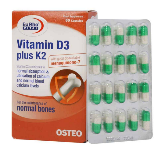 کپسول ویتامین د3 پلاس کا2 یوروویتال (Eurhovital vitamin D3 plus K2 capsules – 60 pcs) یک مکمل تغذیه ای جهت حفظ سلامت استخوان ها، جذب بهتر کلسیم و تقویت سیستم ایمنی می باشد ویتامین د3 موجود در این محصول موجب جذب بهتر کلسیم از طریق روده ها شده کلسیم از طریق روده ها جذب شده و به استخوان ها منتقل می شود و موجب سلامت استخوان ها می شود کلسیم مانع از پوکی استخوان و ضعف استخوان ها می شود ویتامین K2 با تاثیر بر فعالیت سلول های استخوان ساز موجب استخوان سازی بهتر و مانع از تخریب استخوان ها می شود ویتامین د3 با تقویت سیستم ایمنی بدن از بروز عفونت ها و بیماری های مختلف جلوگیری می کند ویتامین K2 نیز موجب کاهش التهاب و تقویت سیستم ایمنی می شود ویتامین K2 از رسوب کلسیم در رگ ها جلوگیری کرده و موجب هدایت کلسیم به سمت استخوان ها می شود و مانع از رسوب آن ها در بافت های نرم مانند رگ ها شده و در نتیجه موجب سلامت قلب و عروق می شود.
