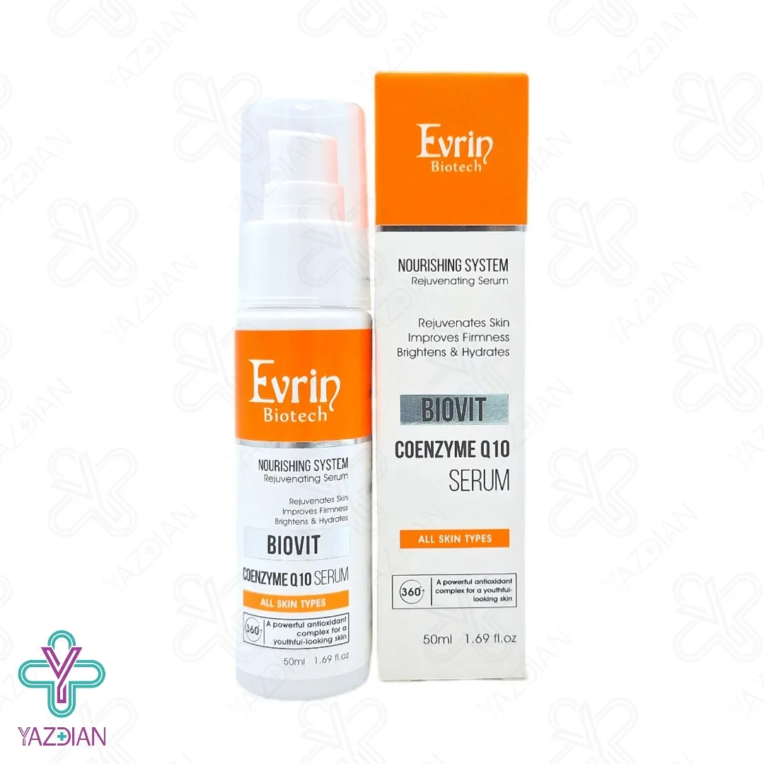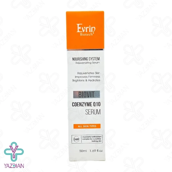 سرم تغذیه کننده پوست کیوتن بایوویت اورین - 50 میلی لیتر (Evrin Biovit Coenzyme Q10 Serum 50ml) حاصل شرکت محبوب آرا درفام آرمین می باشد که جهت آبرسانی و تغذیه پوست تولید شده است. این سرم با بهره گیری از مقادیر بالایی از کوآنزیم Q10 عوامل آنتی اکسیدانی لازم جهت فعالیت های سلولی را تنظیم می کند. بعلاوه از پوست در برابر اشعه UV و اکسیدان ایمن می سازد و حتی خواص ضد چروک نیز دارد