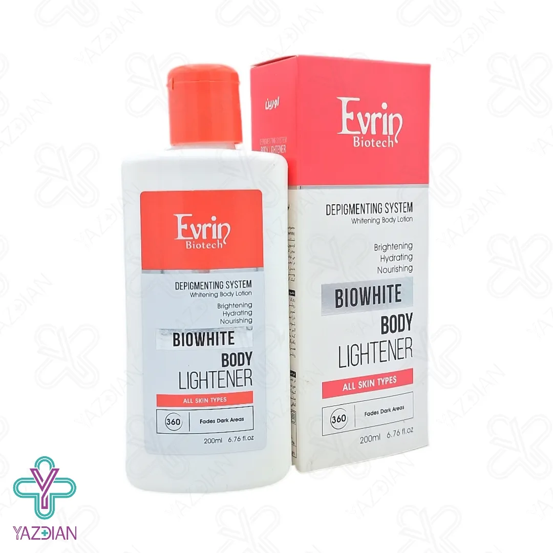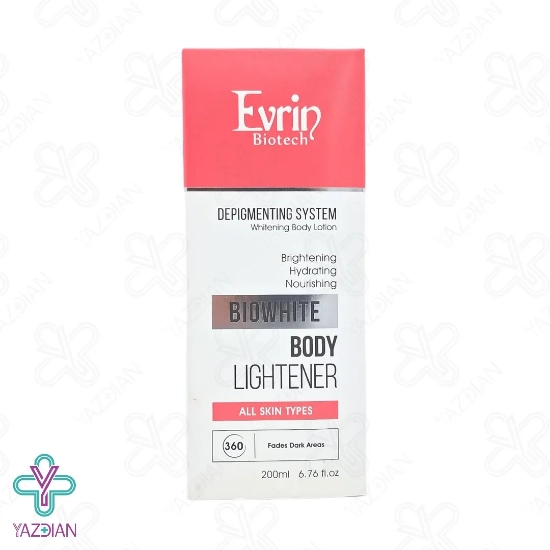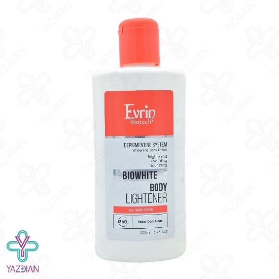 لوسیون روشن کننده بدن اورین (Evrin lightening body lotion – 200 ml) با دارا بودن ترکیبات موثر و فعال ضمن رفع تیرگی های ناشی از افزایش سن، آفتاب، بارداری و تغییرات هورمونی لک ها و آکنه های باقی مانده در اثر جوش و زخم را نیز رفع می کند، این محصول د ارای ترکیبات مغذی می باشد که موجب حفظ رطوبت پوست شده و از خشکی و ترک خوردگی وست جلوگیری می کند، لوسیون روشن کننده اورین برای نقاط حساس بدن مانند زیر بغل، کشاله ران، ژنیتال بسیار موثر بوده و تیرگی های این نواحی را بهبود می بخشد و با خواص ضد التهابی که دارد قرمزی های پوستی را کاهش داده و موجب تسکین آن می شود، این محصول فاقد پارابن بوده و قابل استفاده برای انواع پوست حتی پوست های حساس می باشد، لوسیون روشن کننده اورین دارای ترکیباتی مانند رزوزسینول، نیاسینامید، ویتامین سی می باشد که موجب روشن و یک دست شدن رنگ پوست می شود، هیالورونیک اسید موجود در این محصول موجب مرطوب شدن پوست شده و آب را در خود حفظ می کند و هم چنین به رفع خشکی و تیرگی پوست نیز کمک می کند و موجب آب رسانی عمقی پوست می شود.