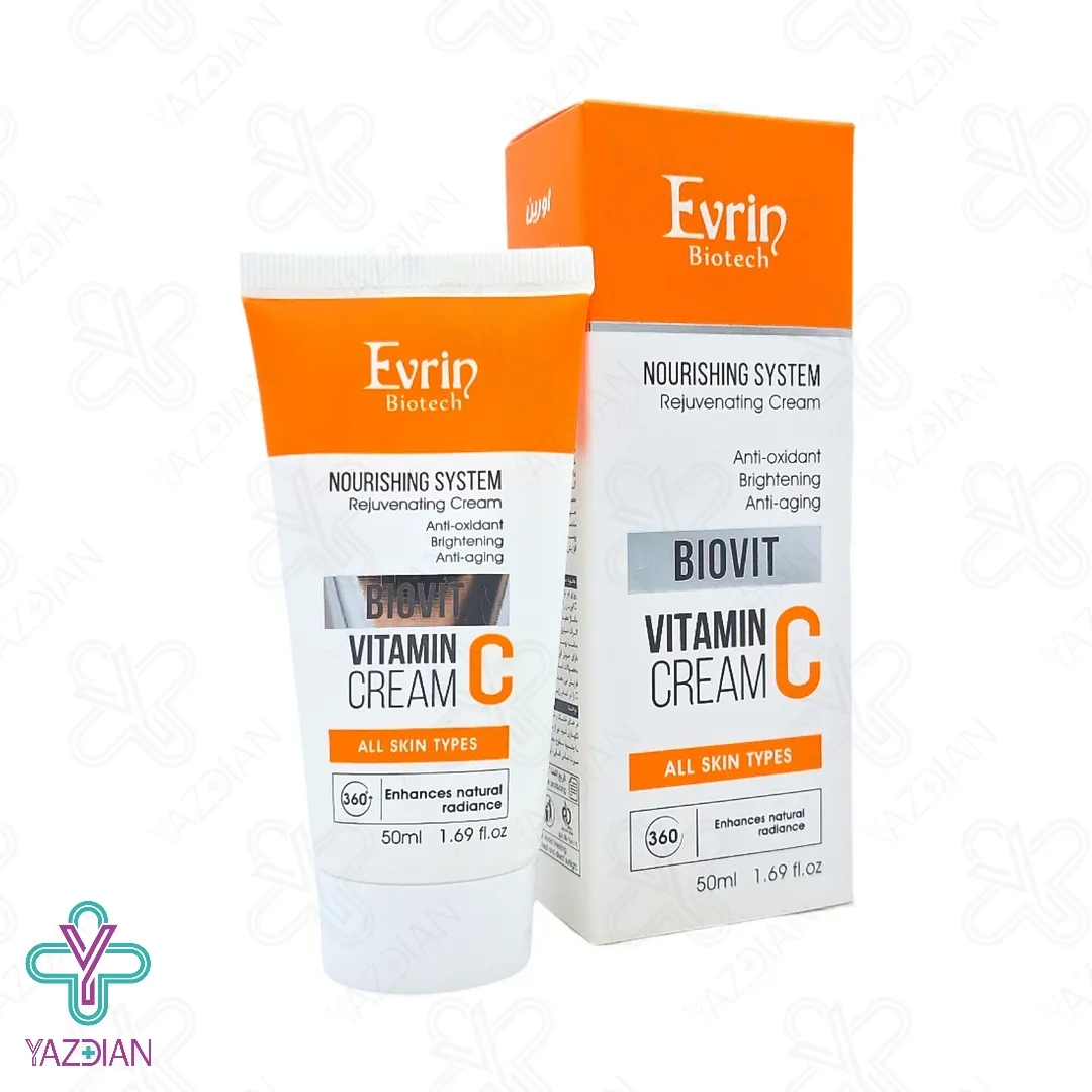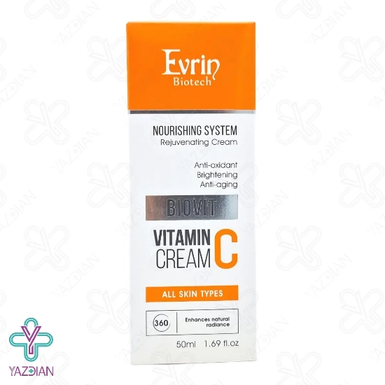کرم مغذی و جوان کننده ویتامین ث اورین (Evrin nourishing and rejuvenating vitamin C cream – 50 ml) پوست را تغذیه کرده و آن را به مدت طولانی آب رسانی و مرطوب کرده و به همین دلیل از خشکی آن پیشگیری می کند، از دیگر ویژگی های این محصول این است که مناسب استفاده برای تمامی پوست ها بوده و از آن در مقابل نور زیان آور آفتاب حفاظت می کند، این کرم دارای دوز بالای ویتامین سی پایدار است به همین دلیل باید طبق دستور از آن استفاده کرد، این محصول تولید کلاژن و الاستین در پوست را افزایش داده و به همین دلیل چین و چروک های ایجاد شده بر روی پوست را بهبود می بخشد، این کرم تیرگی و لک های پوستی را از بین برده و به روشن شدن پوست بسیار کمک می کند، این محصول هم چنین باعث زیاد شدن استحکام پوست شده و نشانه های خستگی را از روی پوست برطرف می کند و در نتیجه پوستی نرم، جوان و شاداب به شما می بخشد.