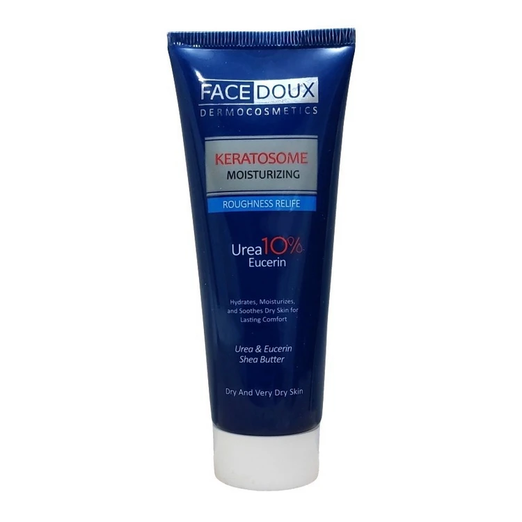 کرم مرطوب کننده و نرم کننده اوسرین و اوره 10 درصد کراتوزوم فیس دوکس - 75 میلی لیتر(face doux keratosome moisturizing urea 10 eucerin 75 ml) با بهره گیری از اوره، اوسرین، شی باتر و روغن بادام، عملکرد قدرتمندی در آبرسانی، ترمیم و محافظت از پوست دارد. اوره در واقع یکی از اجزای طبیعی پوست است که با حفظ و جذب رطوبت، مانع از ترک خوردگی و خشکی های پوستی می شود. همچنین در صورت اگزما، خشکی شدید یا پسوریازیس، خارش و التهابات پوستی را کاهش می دهد. اوسرین نیز یک لایه محافظتی روی پوست ایجاد می کند و از تبخیر آب پوست پیشگیری می کند. همچنین بافت اوسرین به صورتی است که امکان حمل و جذب بهتر داروها و ترکیبات فعال را برای پوست فراهم می کند. بافت غلیظ اوسرین به گونه ای است که پوست های خشک و زبر را به سرعت نرم و مرطوب می کند.