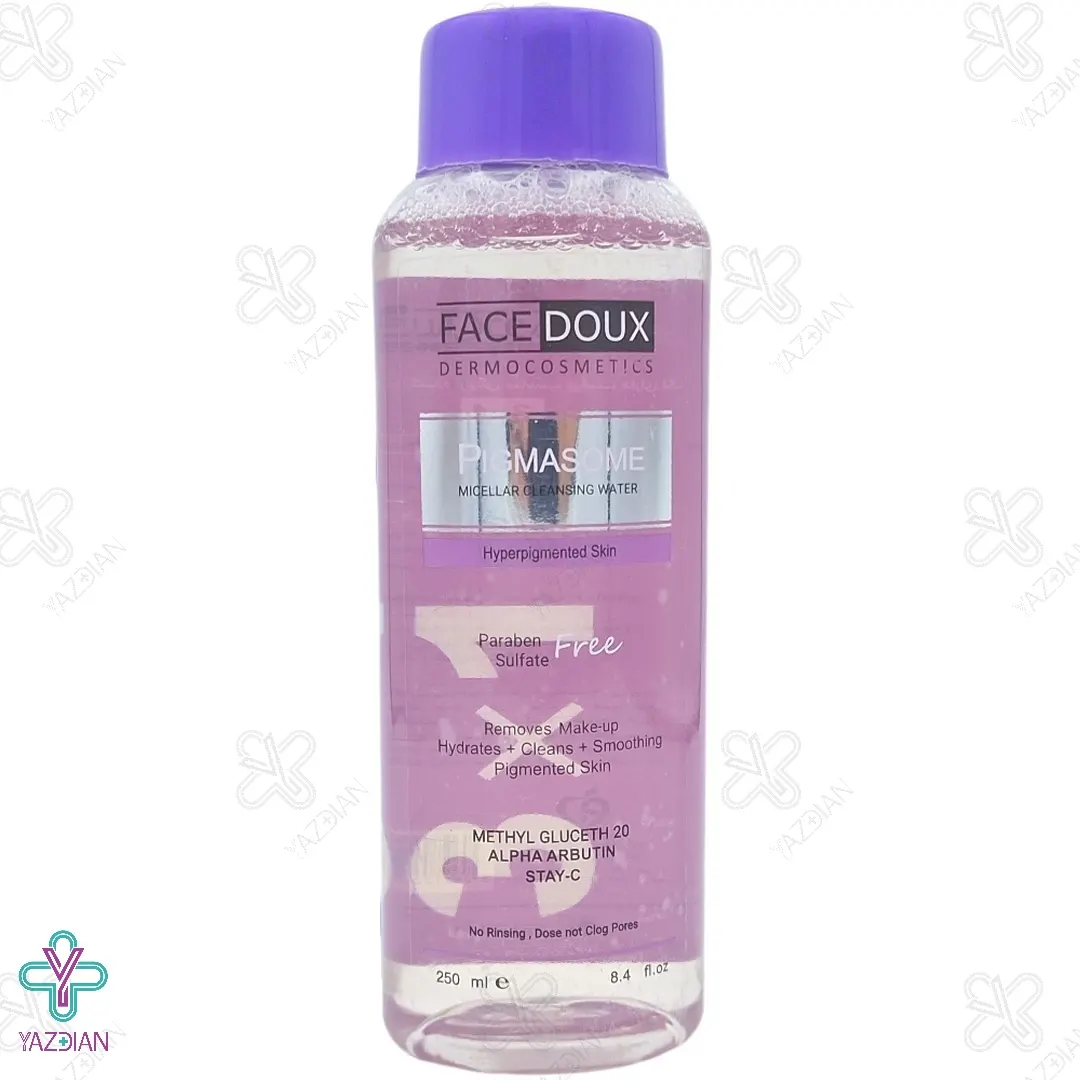 محلول پاک کننده آرایش و ضد لک پیگمازوم فیس دوکس (Facedoux Pigmasome Micellar Cleansing Water 250 ml) با دارا بودن مواد پروبیوتیک و PH فیزیولوژیک برای پوست های لک دار مناسب بوده و بدون این که به آبکشی نیاز داشته باشد مواد آرایشی را از روی پوست پاک می کند و فلور طبیعی پوست را نیز حفظ می نماید.