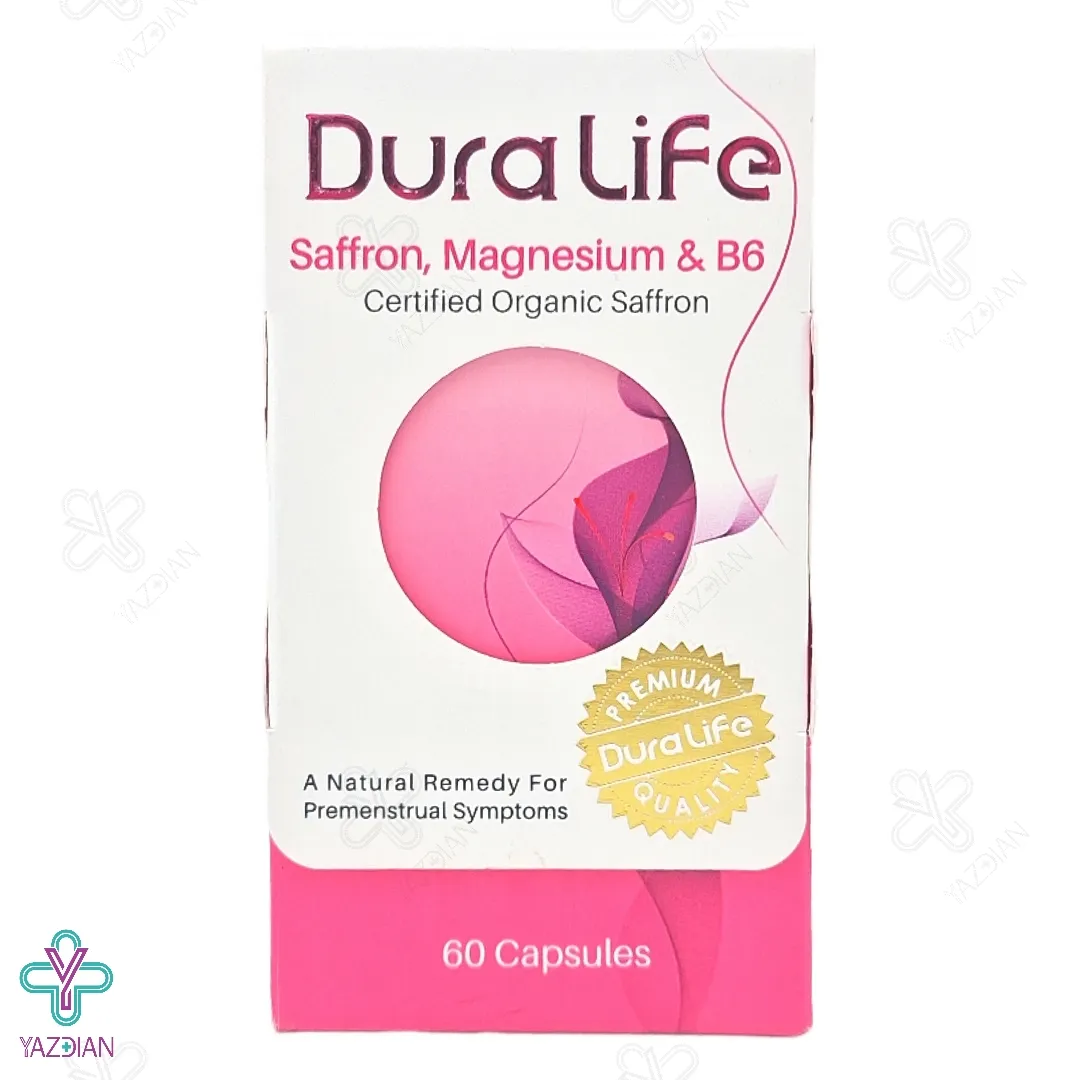 کپسول سافرون منیزیم و ب6 دورالایف فاران شیمی (Faran Shimi Dura Life Saffron Mangnesium And Vitamin B6 60 Caps) یکی از بهترین داروهای تقویتی بدن می باشد که با بهره گیری از ترکیبات مؤثر و مفید خود می تواند عملکرد مغز و حافظه را بهبود بخشیده و سطح انرژی بدن را نیز ارتقا ببخشد. این مکمل همچنین می تواند علائم سندروم پیش از قاعدگی را بهبود بخشیده و برطرف نماید.