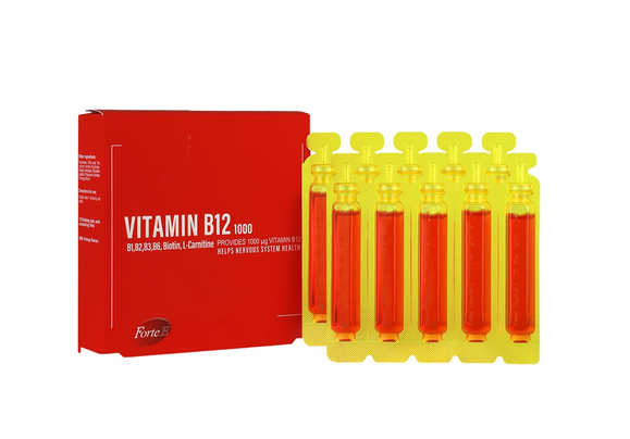 ویال خوراکی ویتامین ب12 1000 فورت ایی (Forte E vitamin B12 1000 mcg- oral vials ) یک مکمل غذایی جهت تامین و جلوگیری از کمبود ویتامین ب12 می باشد این محصول موجب تقویت سیستم ایمنی، عصبی ، تشکیل گلبول های قرمز سالم، ساخت DNA و جلوگیری از ایجاد کم خونی مگالوبلاستیک می شود ویتامین ب12 در سنتز DNA و ساخت گلبول های قرمز بسیار نقش مهمی داشته و در صورتی که این ویتامین در بدن کم باشد ساخت DNA و تقسیم سلولی دچار اختلال شده و دچار کم خونی مگالوبلاستیک می شود در این نوع کم خونی نقل و انتقال اکسیژن در بدن دچار اختلال شده و در نتیجه موجب بروز ضعف و خستگی می شود ویتامین ب12 جهت متابولیسم تولید انرژی و عملکرد طبیعی سیستم عصبی ضروری می باشد این محصول با دارا بودن ویتامین های گروه ب و ال کارنیتین موجب تنظیم متابولیسم چربی، پروتئین ها و کربوهیدرات ها شده ودر بهبود فرآیندهای سوخت و ساز بدن کمک کرده و موجب تنظیم وزن و افزایش استقامت بدن می شود ال کارنیتین با انتقال اسیدهای چرب به میتوکندری موجب تولید انرژی از چربی ها شده و یک محصول ایده آل بوده برای ورزشکاران و افرادی که فعالیت بدنی بالایی دارند.