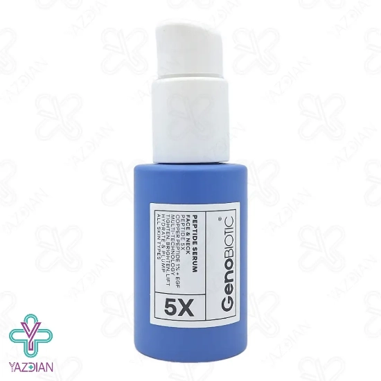 سرم پپتاید یک درصد صورت و گردن ژنو بایوتیک (Genobiotic Peptide Serum – 30 ml) دارای ترکیبات موثری است که موجب تحریک سلول های پوستی به صورت هم زمان شده و در نتیجه سنتز کلاژن و الاستین را افزایش می دهد این محصول با دارا بودن پپتایدهای موثر موجب کاهش چین و چروک پوستی می شود و موجب بهبود استحکام و خاصیت ارتجاعی پوست می شود سرم پپتاید ژنو بایوتیک پوست را به صورت عمقی آب رسانی کرده و مانع از خشکی و کشیدگی پوست می شود و به درخشش و شادابی آن کمک می کند این محصول با بافت سبکی که دارد سریع در پوست جذب شده و قابل استفاده برای انواع پوست می باشد هیالورونیک اسید موجود در این محصول موجب آب رسانی صورت و گردن شده و موجب نرم شدن پوست می شود ویتامین سی موجود در این محصول به روشن شدن پوست کمک کرده و تولید پروتئین کلاژن در پوست را تقویت می کند پروتئین آلبومینوئید موجود در این محصول از عصاره مروارید موجب ترمیم و بازسازی بافت پوست شده و از چین وچروک های سطحی پوست صورت و گردن نیز جلوگیری می کند.