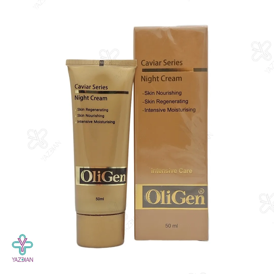 کرم شب مرطوب کننده عصاره خاویار الی ژن (Oligen Night Cream – Caviar Series 50 ml) با دارا بودن عصاره ارزشمند خاویار و دیگر عصاره های مؤثر نظیر پروتئین ابریشم، گل همیشه بهار، روغن آرگان، روغن بذر کتان و ویتامین های E و B5 در فرمولاسیون خود می تواند خاصیت کشسانی پوست را افزایش داده و باعث استحکام و سفتی هر چه بیشتر پوست شود. همچنین آسیب های محیطی و استرس های پوستی را برطرف نماید.