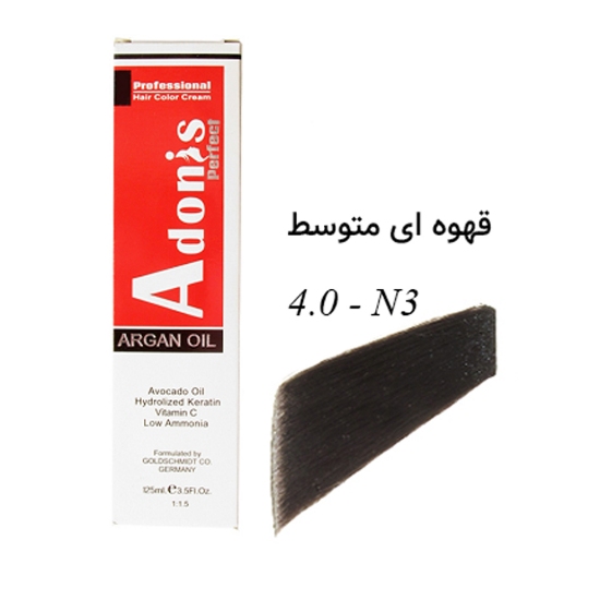 رنگ مو آدونیس در رنگ قهوه ای متوسط مناسب پوشش دهی موهای سفید و یا جو گندمی، حاوی ترکیبات عصاره گیاهانی مانند عصاره گیاه آرگان و عصاره میوه آووکادو، همچنین حاوی انواع ویتامین ها مناسب برای تحولی عظیم در زیبایی هر فردی تولید شده است.