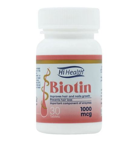قرص بیوتین 1000 میکروگرم های هلث (Hi Health Biotin 1000 mcg tablets – 30 pcs) یک مکمل مناسب جهت حفظ سلامت پوست، مو و ناخن ها می باشد این محصول دارای بیوتین یا همان ویتامین H می باشد که در متابولیسم درشت مغذی ها بسیار موثر می باشد بیوتین موجب تقویت فولیکول های مو شده و در کاهش ریزش مو و افزایش رشد آن بسیار موثر می باشد مکمل بیوتین برانسون موجب کاهش و بهبود بیماری های التهابی پوست شده و با حفظ رطوبت پوست موجب کاهش خشکی و پوسته پوسته شدن می شود و هم چنین موجب تقویت و افزایش استحکام ناخن ها شده و برای افرادی که دارای ناخن های شکننده می باشند بسیار کارآمد می باشد.