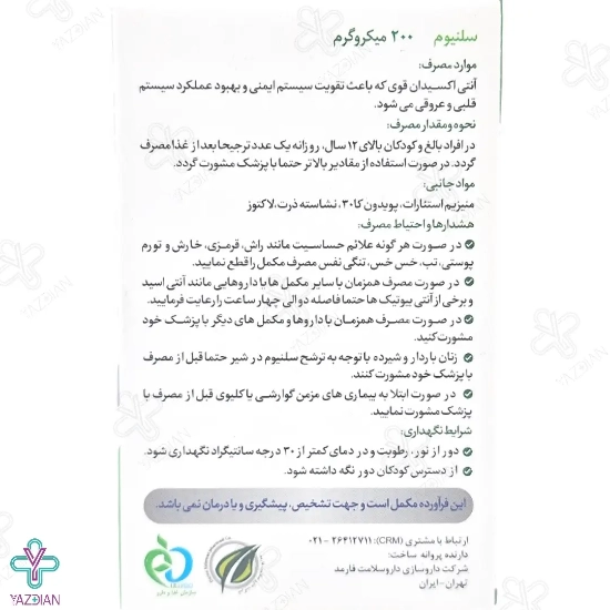 به علت آن که سلنیوم در شیر ترشح می شود خانم های باردار و شیرده قبل از استفاده از این قرص با پزشک خود مشورت کنند.