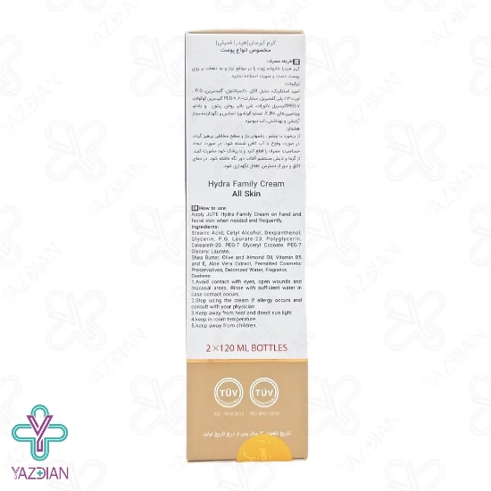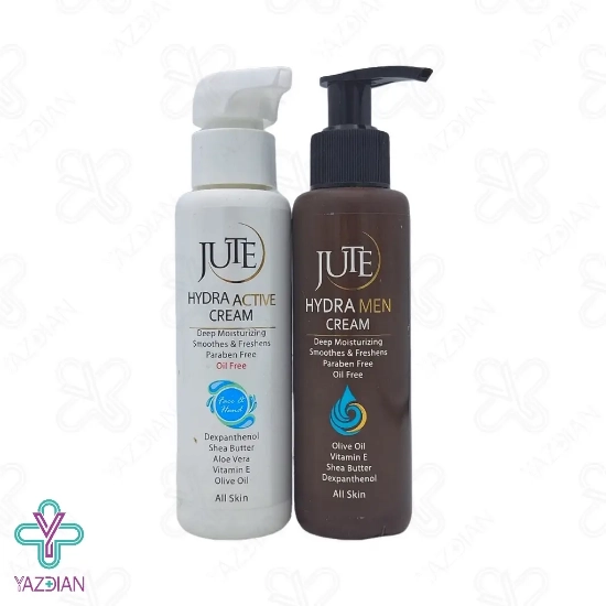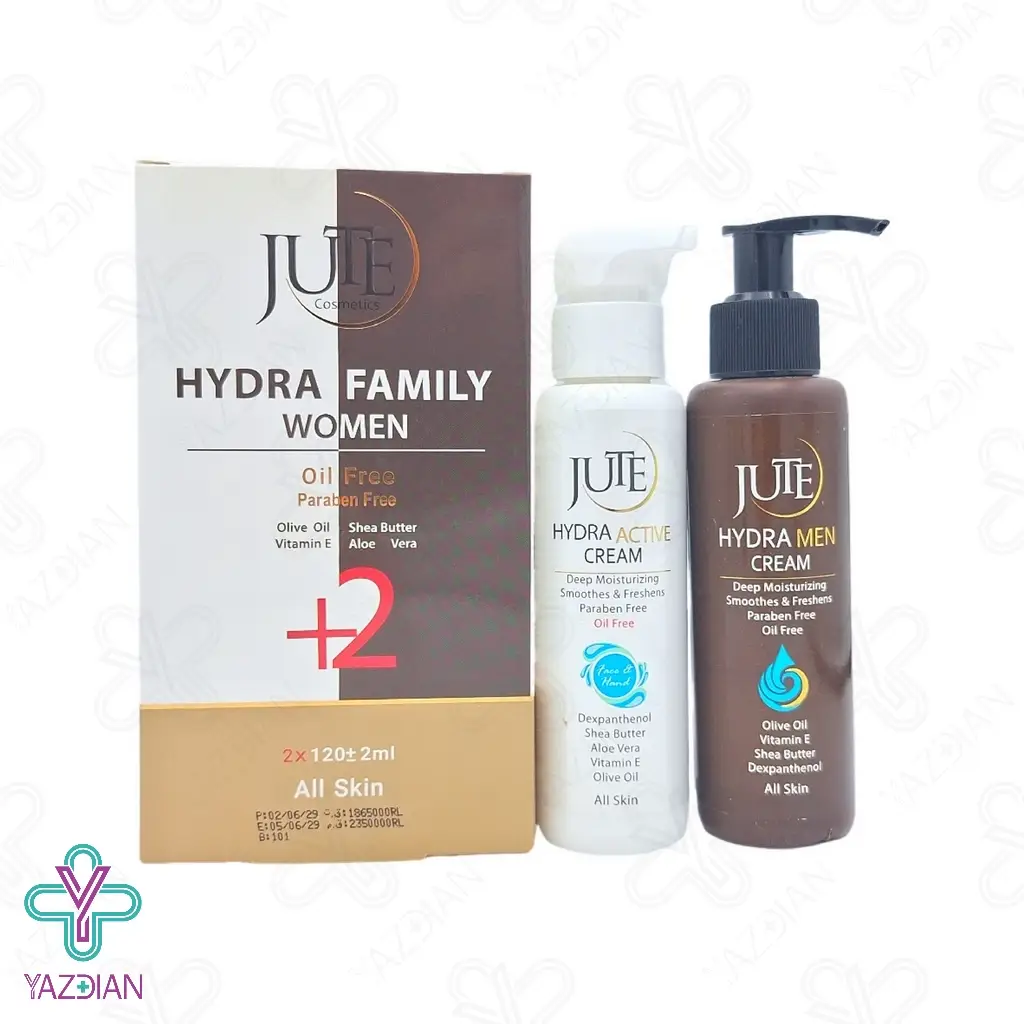 کرم آبرسان دوقلو هیدرا فمیلی ژوت (Hydra Family JUTE Twin Hydrating Cream - 240 ml) دارای دو کرم آبرسان جهت استفاده برای آقایان و خانم ها می باشد، این محصول با ترکیبات موثری که دارد دارای خاصیت آنتی اکسیدانی بوده و زا پوست در برابر رادیکال های آزاد محافظت می کند و هم چنین موجب تسکین و التیام پوست نیز می شود، کرم آبرسان فمیلی ژوت موجب تامین رطوبت پوست شده و با آب رسانی پوست به نرم شدن آن کمک می کند و پوست شاداب و لطیفی را به ارمغان می آورد، این محصول فاقد چربی و پارابن می باشد و با بافت سبکی که دارد سریع در پوست جذب شده بنابراین هیچ گونه احساس چربی اضافه و سنگینی بر روی پوست ایجاد نمی کند، فرمولاسیون این محصول به گونه ای می باشد که برای هر نوع پوست قابل استفاده می باشد، آلوئه ورا از ترکیبات موجود در این محصول می باشد که ضمن آبرسانی پوست موجب تسکین خارش و خشکی پوست شده و هم چنین ترشح چربی پوست را نیز تنظیم می کند و موجب روشن شدن پوست نیز می شود، ویتامین E نیز از دیگر ترکیبات این محصول می باشد که موجب آب رسانی و مرطوب شدن پوست شده و هم چنین موجب کلاژن سازی پوست می شود و آکنه و جای جوش های قدیمی را نیز از بین می برد و ضمن کاهش التهابات پوستی موجب درمان زخم و رفع چین و چروک نیز می شود، شی باتر موجود در این محصول نیز دارای خاصیت آنتی اکسیدانی بوده و موجب محافظت پوست در برابر رادیکال های آزاد شده وهم چنین موجب آب رسانی پوست نیز می شود.