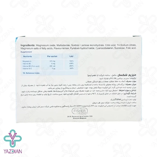ساشه منیزیم 375 میلی گرم فلکسان(Magnesium sachet 375 mg Flexan – 30 pcs ) یک مکمل بوده که حاوی برخی از ویتامین های گروه ب می باشد، در هر ساشه این مکمل 375 میلی گرم منیزیم به کار رفته است که ضمن حفظ سلامت مفاصل از اختلالات سیستم عصبی و عضلانی جلوگیری می کند هم چنین موجب کنترل قند خون، تنظیم فشار خون نیز می شود و به رفع گرفتگی و اسپاسم عضلانی کمک کرده و موجب رفع خستگی عضلانی نیز می شود، هر ساشه این محصول نیاز روزانه منیزیم در یک فرد بزرگسال را تامین می کند در این محصول از ویتامین های ب6، ب9، ب12 و فولیک اسید نیز استفاده شده است، فرم این محصول به صورت پودر طراحی شده است که به جذب سریع تر آن نسبت به کپسول و قرص کمک کرده و اثر سریع تری بر بدن می گذارد، این محصول یک ماده معدنی می باشد که به شل شدن ملایم عضلات کمک کرده و بسیار مناسب برای ورزشکاران می باشد منیزیم را می توان در مکمل هایی که سبب حفظ آرامش یا در قرص های خواب آور یافت زیرا دارای قدرت آرام بخش در سیستم عصبی بوده و سبب شده تا خواب بهتر و اعصاب ارام تری داشت.