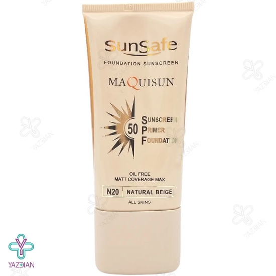 کرم ضد آفتاب SPF50 پودری و پرایمری سان سیف - بژ طبیعی (Maquisun Foundation Sunscreen SPF50- Natural Beige) با برخوداری از زینک اکساید و اتیل هگزیل متوکسی سینامات در ترکیبات خود، یک لایه محافظتی با قدرت زیاد روی پوست ایجاد کرده که اثرات مخرب اشعه های مضر خورشید UVA,UVB,IR را مهار و خنثی می کند. ضمنا با حاوی بودن روغن درخت چای و Sepicontrol A5 در فرمولاسیون خود، ترشح غدد چربی پوست را کنترل کرده و از بروز جوش و آکنه جلوگیری می کند. کوآنزیم Q10 موجود در این کرم ضد آفتاب رنگی نیز روند پیری پوست را به تاخیر انداخته و چین و چروک های پوست را پر کرده و از بین می برد. سیکلوپنتاسیلوکسان موجود در محصول نیز یک سیلیکون حلقوی فرار می باشد که به محض قرار گیری روی سطح پوست، حس مخملی را روی پوست ایجاد می کند.