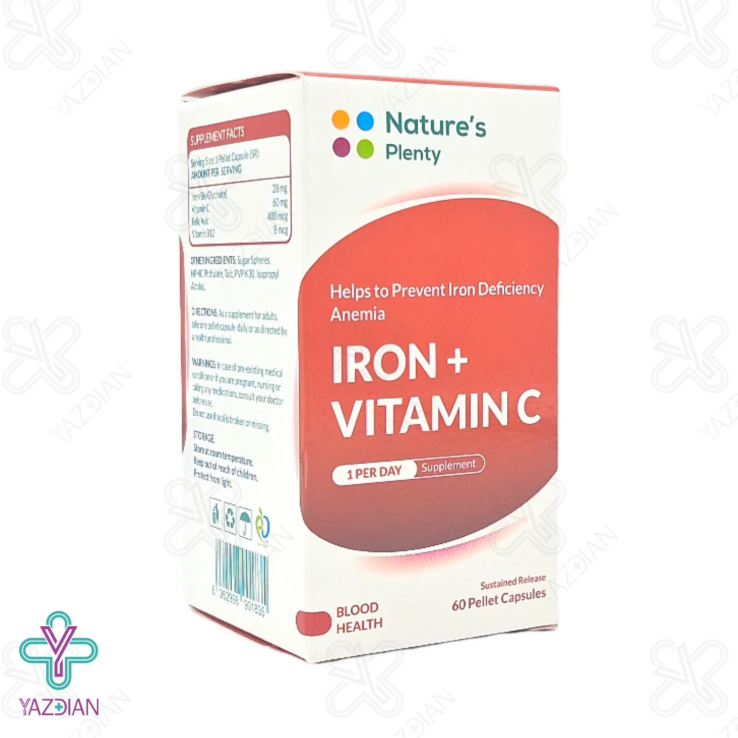 آهن یک ماده ی معدنی مهم است که نقش حیاتی در سلامت گلبول های قرمز دارد که کمبود آن سبب کم خونی ناشی از فقر آهن شده و در نتیجه موجب خستگی های شدید می شود، این بیماری در همه ی سن ها به خصوص در کودکان، خانم های باردار و در دوران قاعدگی بیشتر شایع است، فراهم کردن آهن مورد نیاز از طریق رژیم غذایی امکان پذیر است ولی در بعضی شرایط که نیاز به آهن بالا است استفاده از یک محصول مناسب برای رفع این مشکل توصیه می شود، کپسول آهن آیرون پلاس ویتامین ث نیچرز پلنتی (Natures plenty iron plus vitamin C capsules – 60 pcs) آهن مورد نیاز بدن را تامین کرده و هم چنین برای پیشگیری از کمبود این ماده ی مغذی لازم و ضروری است، از دیگر ویژگی های این محصول آهن موجود در آن است که از نوع بیس گلیسینات بوده و به همین دلیل کمترین عوارض گوارشی را داشته و دارای جذب بهتری نیز است، از دیگر ویژگی های این محصول این است که به تقویت سیستم ایمنی بدن کمک می کند و در نتیجه بدن با بیماری ها و عفونت ها مقابله کرده، این کپسول هم چنین موجب افزایش سطح تمرکز می شود، ترکیب آهن و ویتامین ث در این کپسول باعث جذب بهتر آهن شده و هم چنین زیست دسترسی آن را بهبود می بخشد.