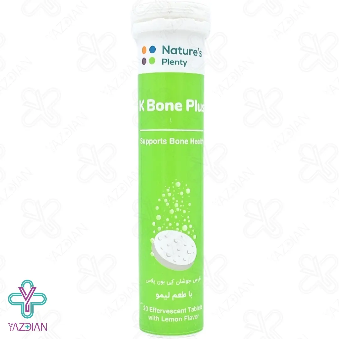 قرص جوشان کلسیم کی بون پلاس نیچرز پلنتی - 20 عددی (Natures Plenty K Bone Plus 20 Effervescent Tabs) از دسته محصولات تقویت استخوان و مفاصل می باشد که با بهره گیری از کلسیم، منیزیم، ویتامین D و ویتامین k، کلیه ریز مغذی های لازم بدن جهت حفظ سلامت استخوان ها را فراهم کرده و تراکم و استحکام استخوان ها را دو چندان می کند.
