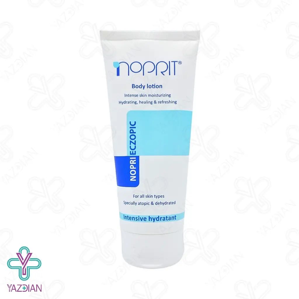 لوسیون بدن نوپری اگزوپیک نوپریت (Nopri Eczopic Noprit body lotion - 200 ml) دارای ترکیبات موثری است که مانع از خشکی پوست می شود و هم چنین موجب مرطوب کردن عمقی پوست شده و از ایجاد خارش و خشکی پوست جلوگیری می کند، در این محصول از روغن های گیاهی استفاده شده است که سرشار از ویتامین ها و مواد معدنی می باشد، روغن دانه کتان یکی از ترکیبات موجود در این محصول می باشد که سرشار از اسیدهای چرب امگا 9 و 6 می باشد و هم چنین دارای ویتامین B ، پتاسیم، منیزیم، فیبر، پروتئین و روی می باشد که موجب کاهش بثورات، التهاب و تحریک پوست شده و از ایجاد آکنه، جوش و اگزما نیز جلوگیری می کند و با تقویت سد دفاعی پوست موجب حفظ رطوبت پوست می شود و عصاره کالاندولا از دیگر ترکیبات موجود در این محصول بوده که دارای خاصیت ضد التهاب و ضد خارش می باشد و موجب رفع خارش شده و هم چنین در ترمیم بافت های سلولی نیز کمک می کند، عصاره آلوئه ورا موجود در این محصول موجب حفظ و تامین رطوبت پوست شده و از ایجاد چین وچروک جلوگیری می کند و ضمن رفع لک و تیرگی پوست موجب رفع التهاب، خشکی و خارش نیز می شود و هم چنین به روشن شدن پوست نیز کمک می کند.