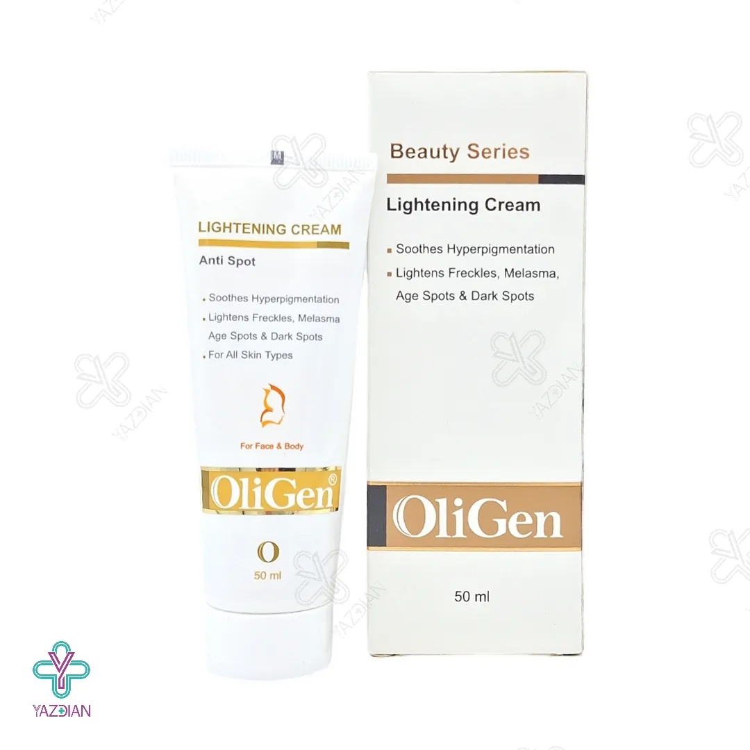 کرم روشن کننده و ضد لک صورت و بدن الی ژن (Oligen Lightening Cream – Anti Spot – Face & Body 50 ml) با دارا بودن کوجیک اسید، نیاسین آمید، رزورسینول، آسکوربیل پالمیتات به همراه عصاره شیرین بیان، روغن هسته انگور و ویتامین E در فرمولاسیون خود می تواند انواع لک را از روی پوست صورت و بدن برطرف نموده و با از بین بردن تیرگی های پوست، باعث روشنی، شفافیت و شادابی هر چه بیشتر پوست شود.