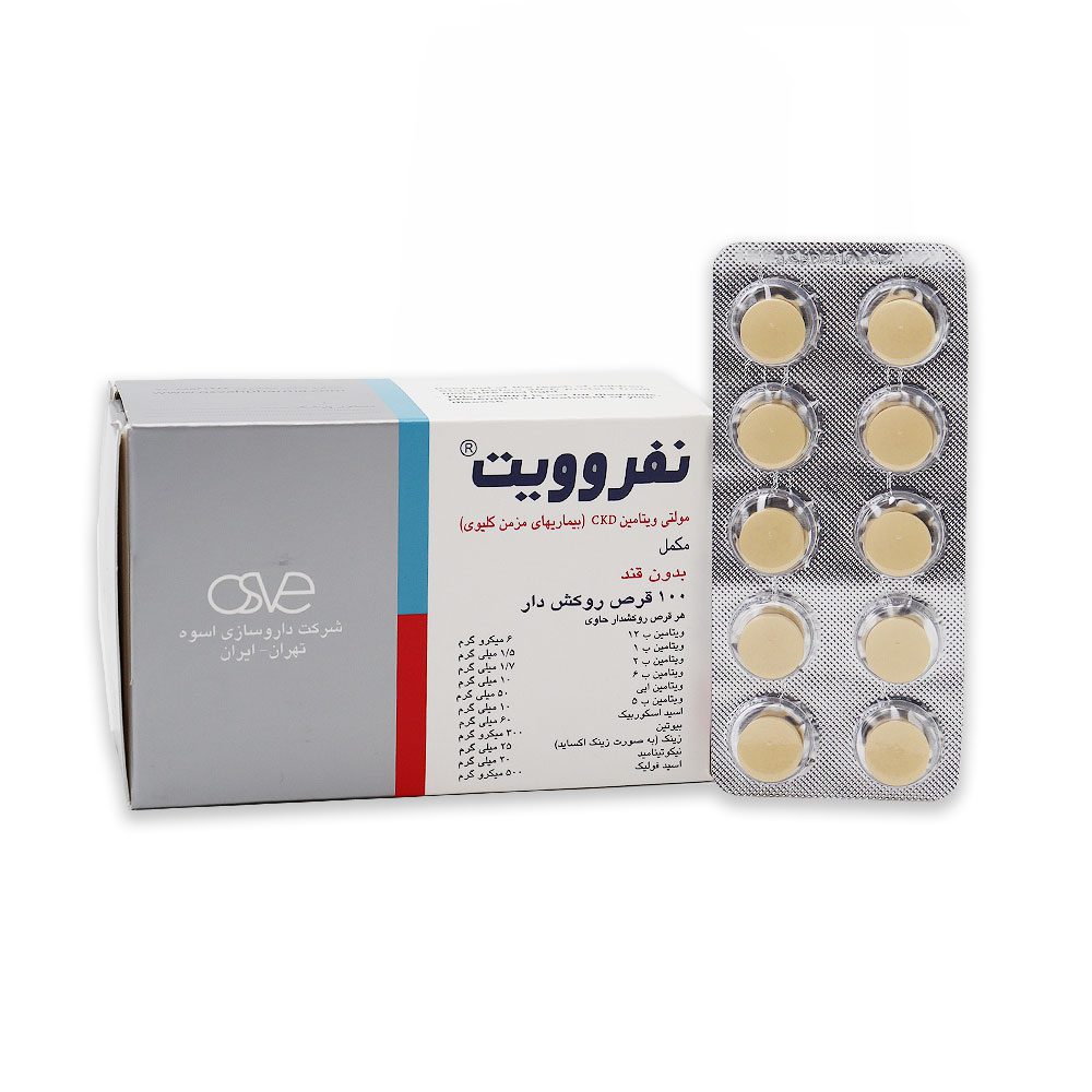 نفروویت دارای مقدار معینی از املاح معدنی ضروری و ویتامین ها برای دوران دیالیز بیماران کلیوی است و اولین بار در ایران توسط شرکت اسوه طراحی شده است و فاقد قند می باشد. این قرص یکی از بهترین مولتی ویتامین ها برای بیماران کلیوی است.