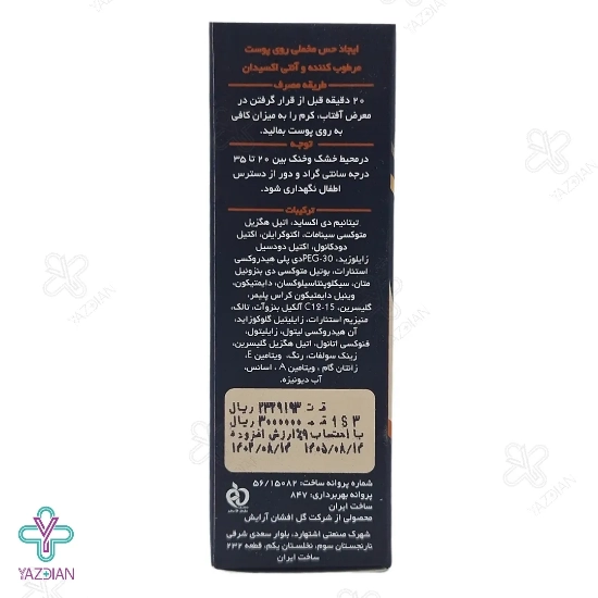 این ضد آفتاب رنگی به دلیل دارا بودن ویتامین های A و E در ترکیبات خود از خواص آنتی اکسیدانی برخوردار می باشد و می تواند از اثرات زیانبار رادیکال های آزاد بر روی پوست کاسته و از پیری زودرس پوست جلوگیری نماید. این کرم فاقد پارابن بوده و استفاده از نرم کننده های سیلیکونی در تهیه آن باعث می شود که بعد از استفاده، حس سنگینی بر روی پوست ایجاد نشده و به خوبی بر روی پوست پخش شود.