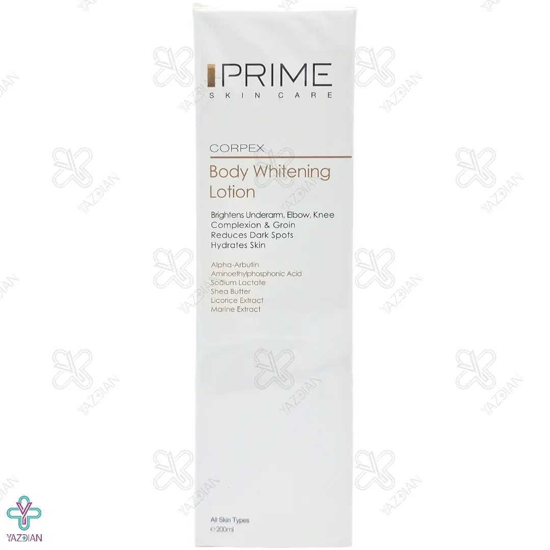 لوسیون روشن کننده بدن پریم - 200 میلی لیتر (Prime Corpex Body Whitening Lotion 200 ml) متناسب با انواع پوست و همه سنین به منظور رفع سیاهی و تیرگی پوست بدن در شرکت پریم تهیه و به بازار عرضه می شود و روشن کننده پوست زیر بغل، کشاله ران، زانوها و آرنج می باشد که بر اثر تغییرات هورمونی، افزایش سن، نور خورشید و دیگر مشکلات به وجود می آید.